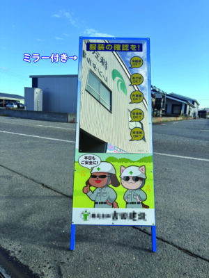 デザイン製作事例 トップページ 保安用品レンタル デザイン製作事例 特注ミラーつき看板 身だしなみをチェックできるミラーがついた看板です。お客様のご要望に合わせ、現場を明るくするようなかっこかわいいイラストも作成ました。 【新商品】クマ対策看板 作業員向けのクマ対策看板です。遭遇した際の対処法や対策などが盛り込まれた看板となっています 透明DX看板 新商品の透明DX看板です。板面がクリアな素材になっており視覚的なデザイン要素が盛り込まれている看板です。 安野川大荒川附帯工工事 立て看板用 連結間伐材ログ枠作成事例 現場の安全掲示板に連結式の立て看板用間伐材を作成した事例となっております。 長岡大橋補修工事 イメージアップ車両デザイン事例 長岡大橋補修工事でのイメージアップ車両作成事例です。 掲示板の内容や現場のイメージアップにつながる4コママンガが記載されたオリジナルのトイレカーです。 道路築造その1工事 現場出入口付近に目に留まりやすい看板を設置し、作業員・地域住民からも興味を示してもらえるようなデザイン看板の事例です。 令和6年度一般国道402号(間瀬地内)護岸整備工事 トイレカーに横断幕を取り付ける際に、 ハトメの穴に合わせて吸盤タイプで脱着可能にして作成した事例。 令和7年度 直江津管内区画線設置工事 安全掲示板【トイレカー施工】 安全掲示板をステッカーで作成し、トイレカーに施工しました。 看板を設置できない場所でも掲示板の内容を掲示できます! 長岡市飯塚地内 (国)351号防災安全(雪寒)防雪柵設置工事 (国)351号防災安全(雪寒)防雪柵設置工事 イメージアップ看板の設置事例です。 枠に間伐材をつけ、視覚的にもインパクトがある看板になっています。 マンガ看板 地域の方々に交通安全を呼びかけるイメージアップ看板です。写真の看板は子ども向きの自転車交通安全の内容です。 1 / 512345»