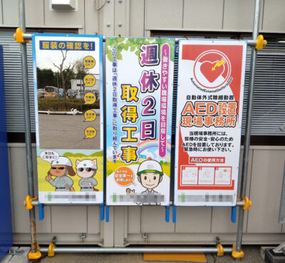 デザイン製作事例 トップページ 保安用品レンタル デザイン製作事例 田沢小栗山線補道更洞小栗山SD塗装塗替工事 イメージアップ車両 イメージアップ車両の作成案件です。 50周年のロゴマークを一面に載せたインパクトのあるイメージアップ車両です。 信濃川やすらぎ堤緑地(右岸)整備工事 イメージアップ看板等 イメージアップ看板や四コマ看板など、歩行者や近隣の方々からも見ていただけるような内容の看板を複数作成しました。(お客様の御厚意で会社名をそのままアップしています) 転落防止柵更新工事 安全掲示板設置事例 使用資材:アルミ複合板、木枠 森林付近での工事なので、背景をログ調にした安全掲示板です 特注ミラーつき看板 身だしなみをチェックできるミラーがついた看板です。お客様のご要望に合わせ、現場を明るくするようなかっこかわいいイラストも作成ました。 【新商品】クマ対策看板 作業員向けのクマ対策看板です。遭遇した際の対処法や対策などが盛り込まれた看板となっています 透明DX看板 新商品の透明DX看板です。板面がクリアな素材になっており視覚的なデザイン要素が盛り込まれている看板です。 安野川大荒川附帯工工事 立て看板用 連結間伐材ログ枠作成事例 現場の安全掲示板に連結式の立て看板用間伐材を作成した事例となっております。 長岡大橋補修工事 イメージアップ車両デザイン事例 長岡大橋補修工事でのイメージアップ車両作成事例です。 掲示板の内容や現場のイメージアップにつながる4コママンガが記載されたオリジナルのトイレカーです。 道路築造その1工事 現場出入口付近に目に留まりやすい看板を設置し、作業員・地域住民からも興味を示してもらえるようなデザイン看板の事例です。 令和6年度一般国道402号(間瀬地内)護岸整備工事 トイレカーに横断幕を取り付ける際に、 ハトメの穴に合わせて吸盤タイプで脱着可能にして作成した事例。 1 / 512345»