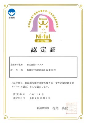 レックスブログ-お知らせ トップページ お知らせ 2025年10月1日 Ni-ful(ニーフル)新潟県多様で柔軟な働き方・女性活躍実践企業「ゴールド認定」 10月1日から始まったNi-ful(ニーフル)「新潟県多様で柔軟な働き方・女性活躍実践企業」に「ゴールド認定」されました。 ・仕事と育児の両立支援 ・働き方改革 ・女性活躍 の項目があります。 まだまだ改善していく項目が […] 2025年4月1日 新潟市健康経営ゴールドに認定されました。 健康経営への取り組みを評価され、新潟市健康経営ゴールドに認定されました。 これからも従業員の健康に向けた取り組みを進めていきます。 2025年2月4日 令和7年新年祈願祭 新潟市中央区にある白山神社におきまして、令和7年新年祈願祭を行いました。 本社役員をはじめ各所責任者が参列し、今年の社業隆盛・工事安全・業務安全・身体健全を神主様よりご祈祷いただきました。 今年も1年ご安全に! &nbs […] 2025年1月14日 NPO法人ばんそうこう様より感謝状をいただきました! 当社の取引先である「NPO法人ばんそうこう」様より感謝状をいただきました。 ばんぞうこう様では、障害者の方が、間伐材を使った工事看板や、漁業用の浮きを再利用したフラワープランターなどを製作されています。 当社では新潟県内 […] 2025年1月6日 2025年もよろしくお願いいたします! あけましておめでとうございます。 弊社のHP及びブログをご覧いただき、誠にありがとうございます。 昨年も皆様のご支持をいただきながら、事業を展開することができました。心より感謝申し上げます。 本年も変わらぬご愛顧のほど、 […] 2024年11月5日 令和6年度新潟市優良工事表彰を受賞しました! この度、当社施工の「一般国道403号(小阿賀野橋)塗装塗替(その3)工事」及び「主要地方道新潟新発田村上線(大形本町3丁目他地内)舗装修繕工事」が、令和6年度新潟市優良工事を受賞いたしました。 今後も皆様のご期待に沿える […] 2024年8月19日 新潟まつりに参加しました! 今年も8月9日(金)~11日(日)に開催された新潟まつりに参加しました。 当社は、福田グループとして「大民謡流し」に、17名で参加し新潟甚句を踊りました。 当日は天気も良く、素晴らしいお祭りとなりました。 福田グループに […] 2024年7月19日 インターンシップを受け入れました 7月17日(水)~7月19日(金)にかけて、新発田営業所にて新発田南高校の生徒2名のインターンシップを行いました。 初日の午前は会社説明、午後からは村上市内で区画線の工事を見学しました。 2日目は新発田南高校の玄関の階段 […] 2024年5月15日 第49回 創立記念式 第49回創立記念式・祝賀会を行いました。 おかげさまでレックスは今年49周年を迎えることができました。 これからも地域環境の総合維持管理を通して、皆様の安心・安全な暮らしを守ってまいります。 式典では10年・20年・30 […] 2024年4月1日 令和6年 新入社員が入社しました! 4月1日に入社式が行われ、新入社員が入社しました。 今年は工事部9名が入社しました。 みなさん元気いっぱいで、これからの活躍がとても楽しみです! 1 / 812345...»最後 »
