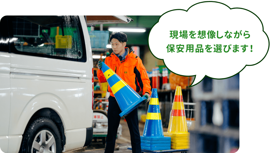 保安用品のレンタル・販売担当が、保安用品を準備します。橋の塗り替え工事では、橋の下にもぐって作業を行うので、車道や歩道の通行規制が必要です。工事の内容や周りの様子に合わせて、カラーコーンや看板などの設置場所や数量を考えます。