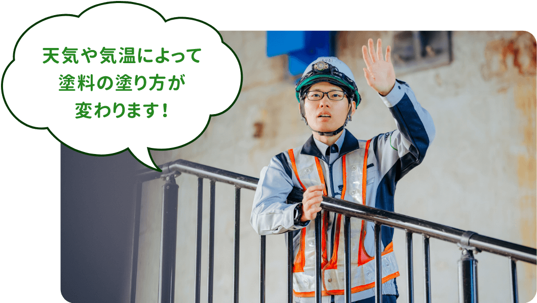 施工管理担当が、現場をまとめます。橋の塗り替え工事では、車や人が通る中で、橋の上や下に足場を組んで作業をします。現場の段取りをしながら、足場業者や塗装業者などに作業内容を伝え、安全や品質を確認しながら工事を進めます。