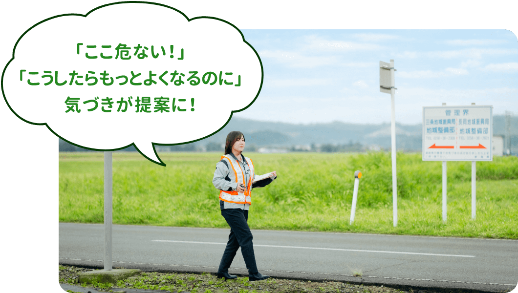 パトロールチームが日々県内の道路をパトロールし、報告を受けた営業担当が現地調査を行います。道路の状態や周辺環境を確認し、課題に応じた対策を考えたうえで、道路管理者へ改善のアイデアを提案します。