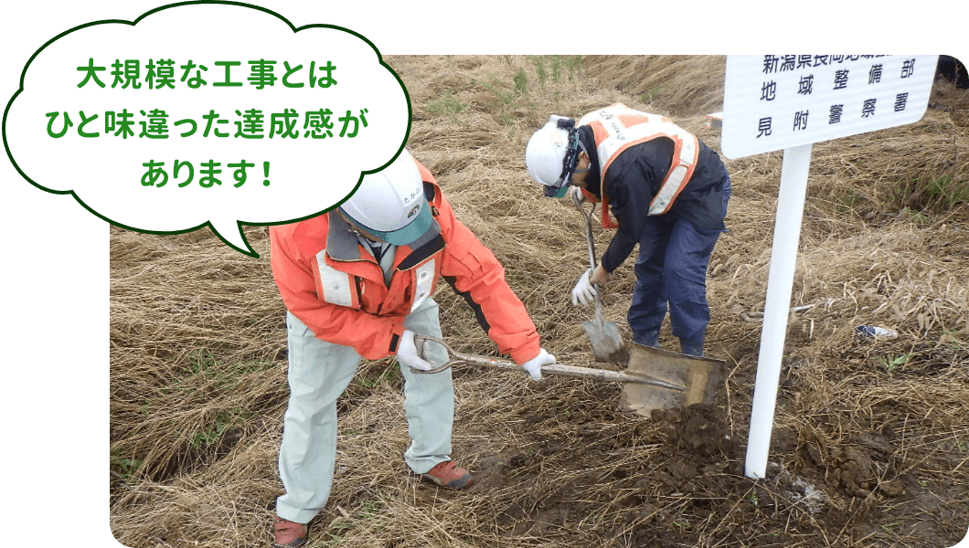 規模の小さい工事では、調査から施工までをすべて自分たちで行うことがあります。工事担当は、作業の段取りや必要な準備をし、安全に配慮しながら工事を進めていきます。