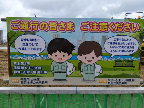 デザイン製作事例 トップページ 保安用品レンタル デザイン製作事例 信濃川やすらぎ堤緑地(右岸)整備工事 イメージアップ看板等 信濃川やすらぎ堤緑地(右岸)整備工事 イメージアップ看板等 イメージアップ看板や四コマ看板など、歩行者や近隣の方々からも見ていただけるような内容の看板を複数作成しました。(お客様の御厚意で会社名をそのままアップしています) デザイン製作事例一覧へ